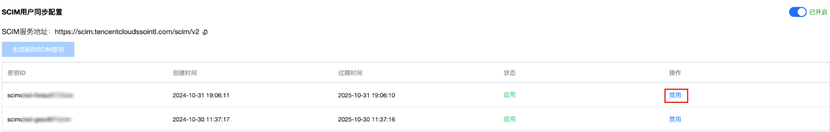 3. 在 SCIM 用户同步配置区域,单击目标 SCIM 密钥的禁用。