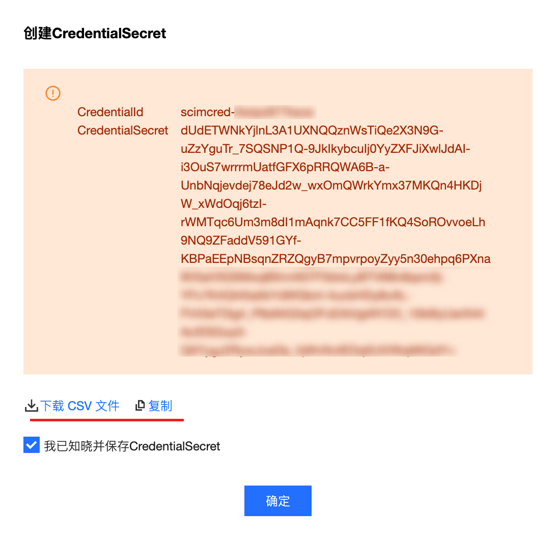 4. 在创建 CredentialSecret 对话框中,您可以通过下载 CSV 文件或复制来保存 SCIM 密钥。保存好密钥后,单击确定。