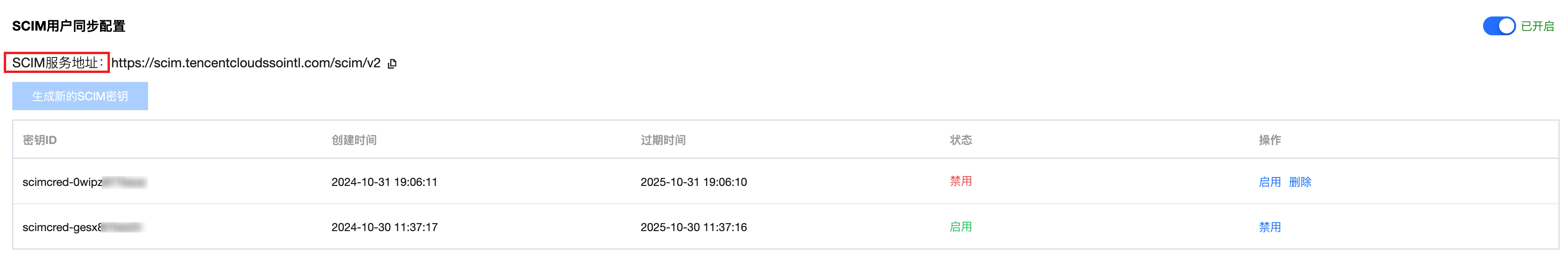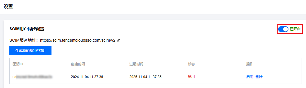启用 SCIM 同步后,您才能从外部 IdP 同步用户或用户组到身份中心。同时,您还需要创建 SCIM 密钥。