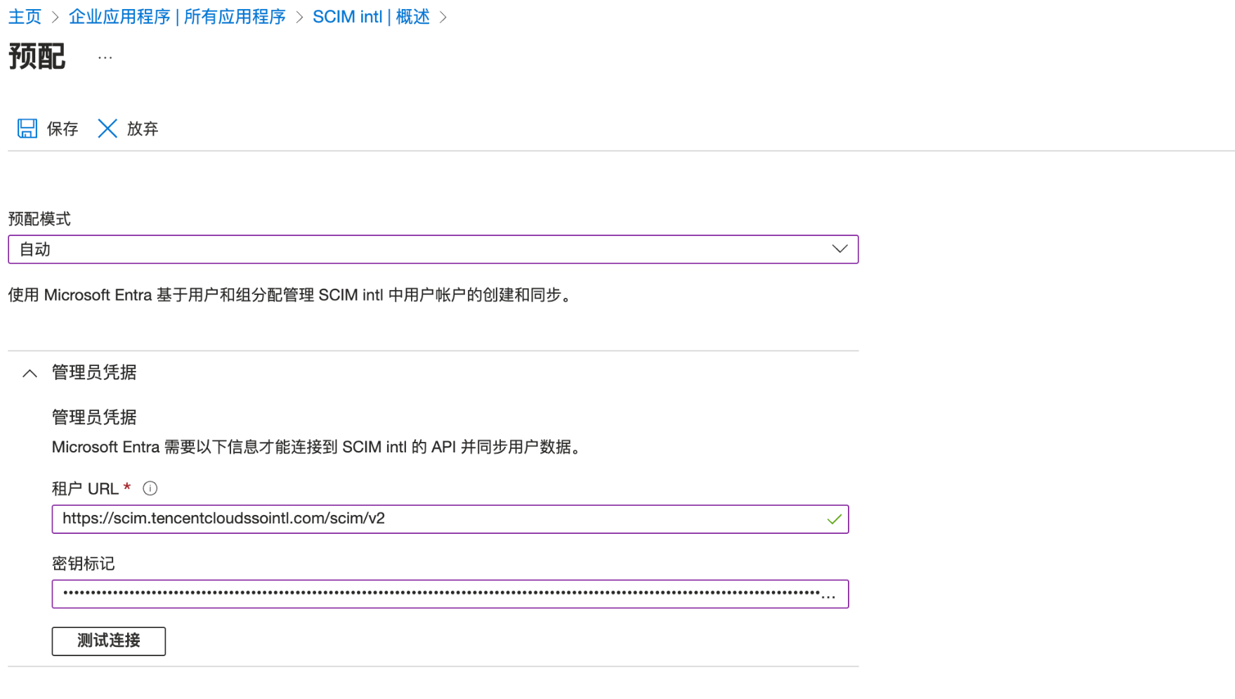 在密钥标记区域,输入 SCIM 密钥。