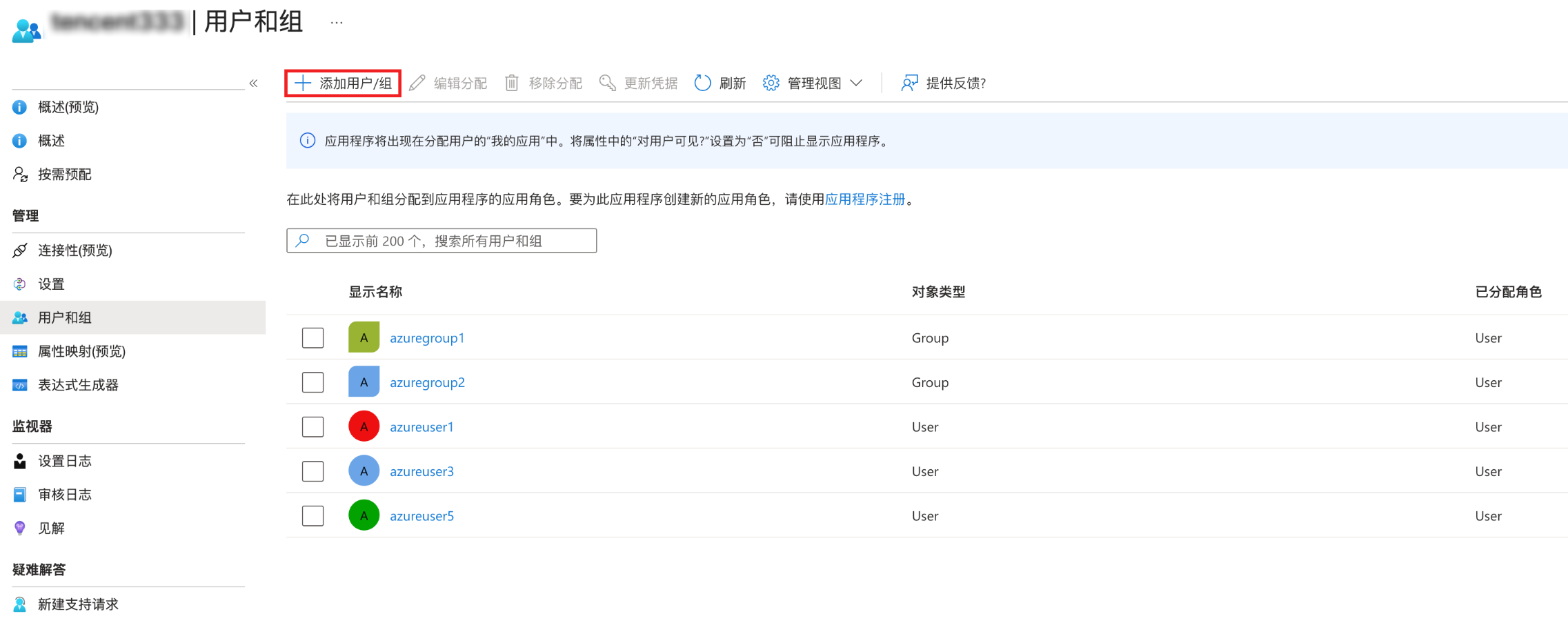 1. 在预配页面的左侧菜单,选择用户和组,单击添加用户/组。