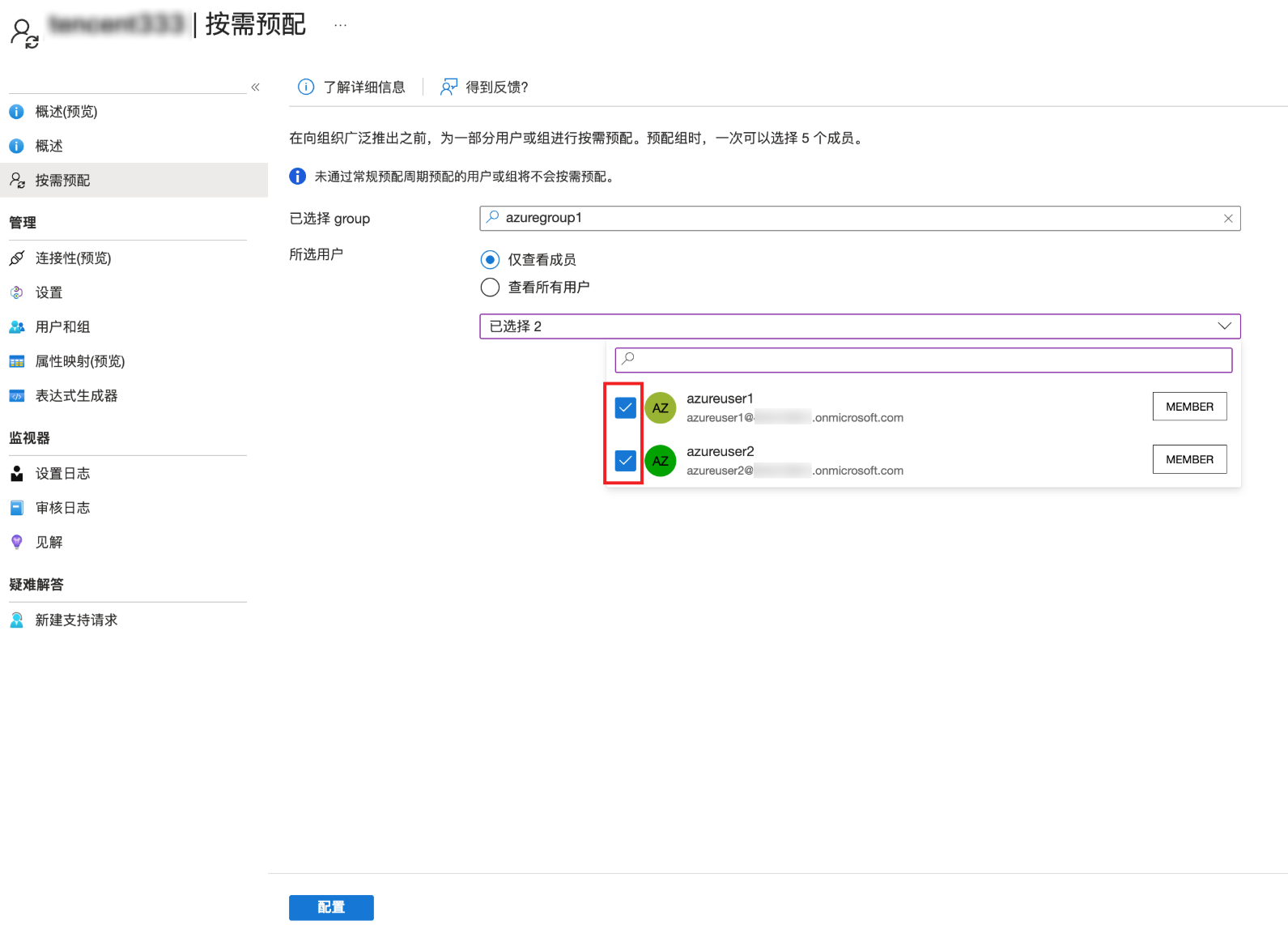 1. 在按需预配页面,选择需要同步的用户组,并同时勾选组内的用户,单击配置。