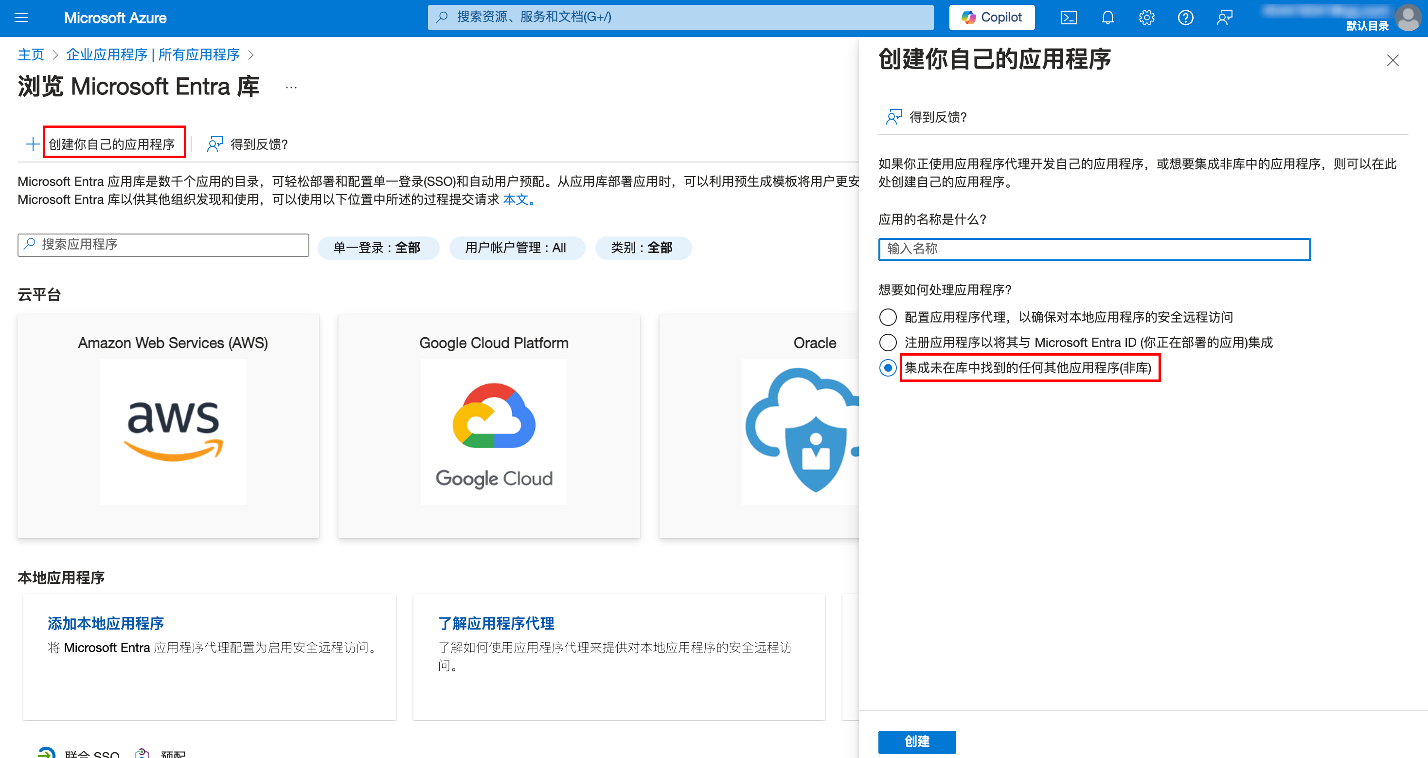 5. 在浏览 Microsoft Entra 库页面,单击创建你自己的应用程序,在右侧窗口中,输入应用名称,并选择集成未在库中找到的任何其他应用程序(非库),然后单击创建。
