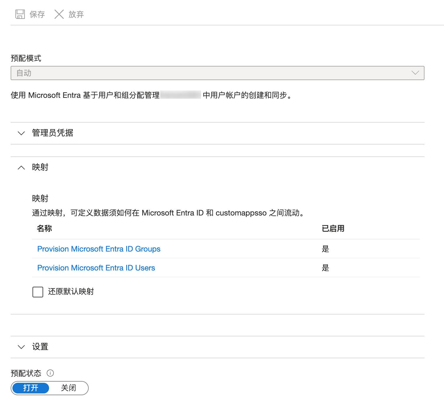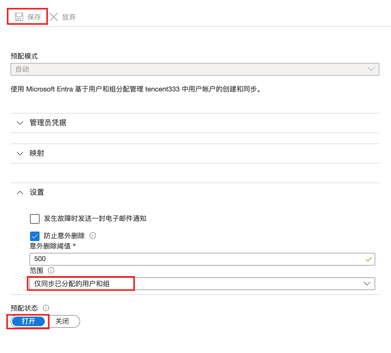 6. 单击预配状态区域的打开,单击保存,配置完成。