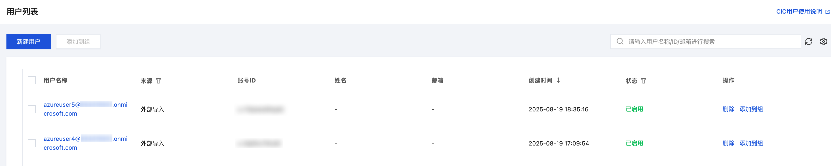 在左侧导航栏,单击用户管理 > 用户,查看列表。来源会自动标识为外部导入。