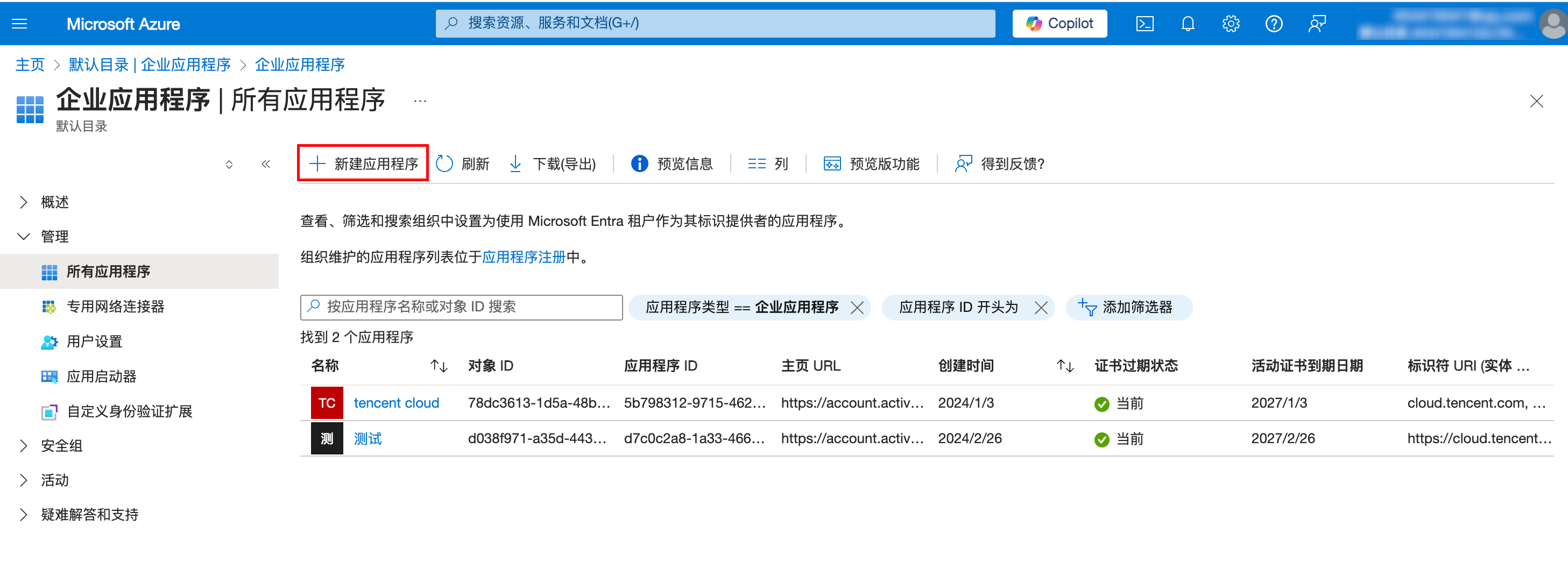 2. 在左侧导航栏,选择 Microsoft Entra ID。 3. 在左侧导航栏,选择管理 > 企业应用程序后,进入所有应用程序。 4. 单击新建应用程序。