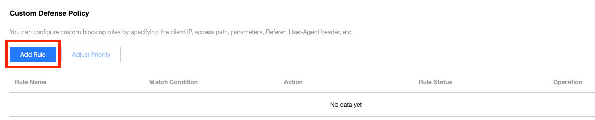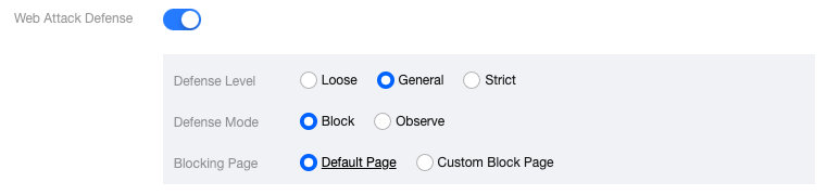 当所购套餐支持弹性防护时,弹性防护默认开启。当所购套餐不支持弹性防护时,弹性防护默认关闭。详情请见 计费说明。 自定义防护策略