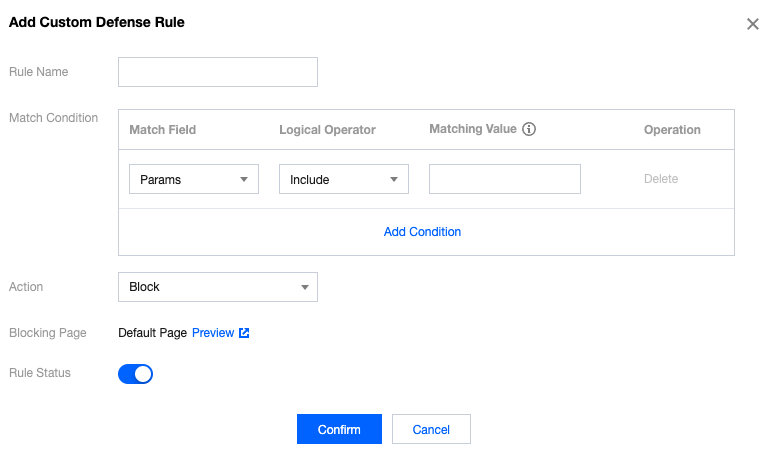 共支持创建五条自定义规则, 每一条规则中可定义五个匹配条件 。规则、匹配条件之间为 “或” 关系,执行顺序按照列表顺序由上至下,满足任意规则中的任意一条条件,即会产生阻断。