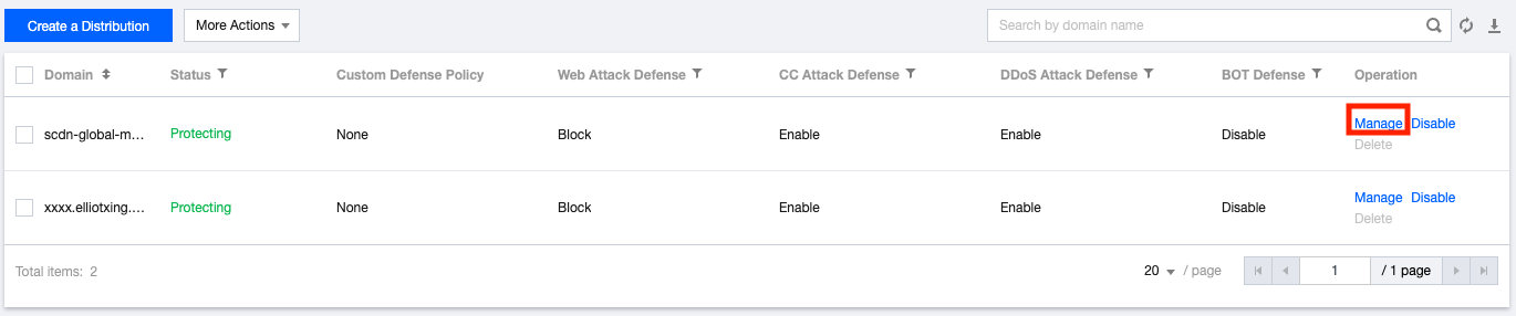 在 SCDN 控制台页面,找到需要查看或变更安全加速服务配置的域名,单击【管理】。
