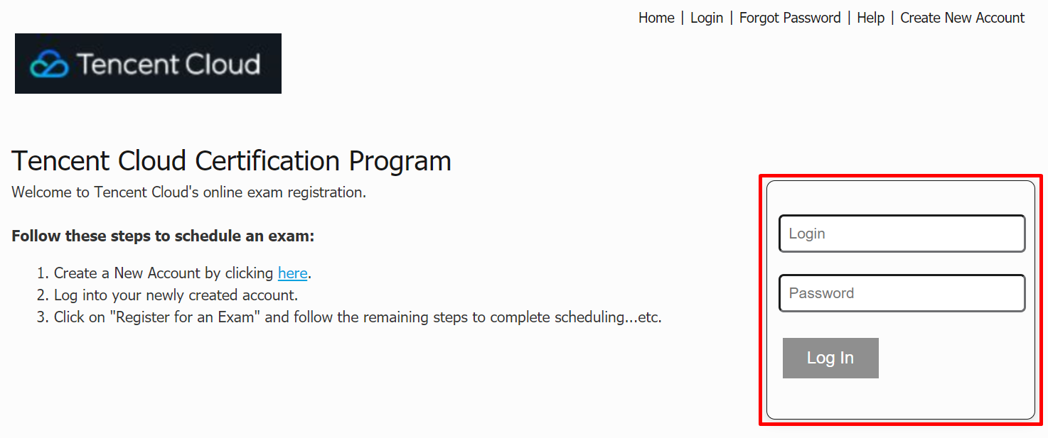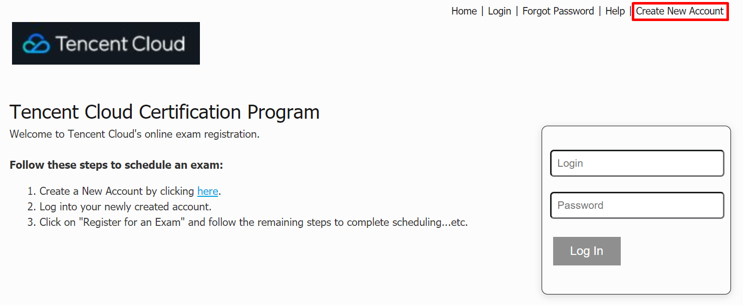Tencent Cloud delivers all of its certification exams online through Kryterion’s Webassessor platform and does not offer in-person testing. To register for a Tencent Cloud certification exam, please visit Tencent Cloud’s certification exam portal on Kryterion and follow the steps below: 1. Click Create New Account to create a Tencent Cloud Webassessor account.