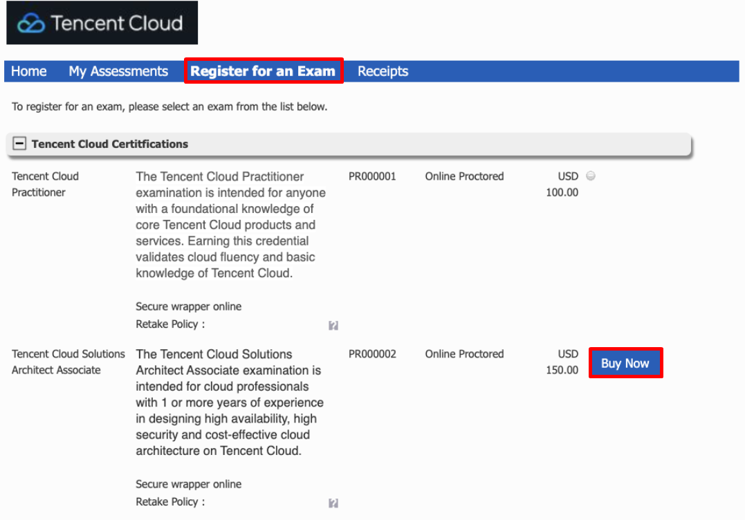 3. Click Register for an Exam and click Buy Now next to the exam you want to take.