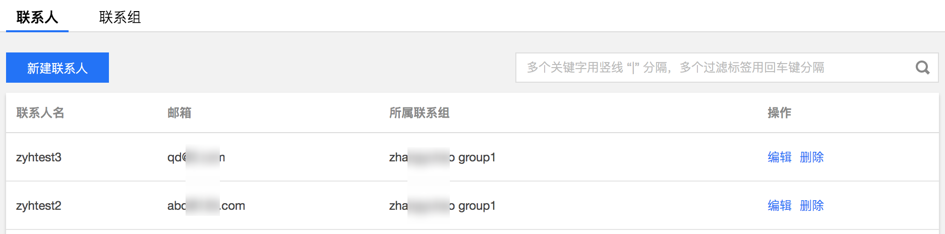 查看联系人:联系人列表中展示了联系人的基本信息,包括:联系人名、邮箱、所属联系组和操作,支持对已创建的联系人进行编辑和删除,也可以根据联系人名、邮箱、所属联系组对联系人进行搜索。