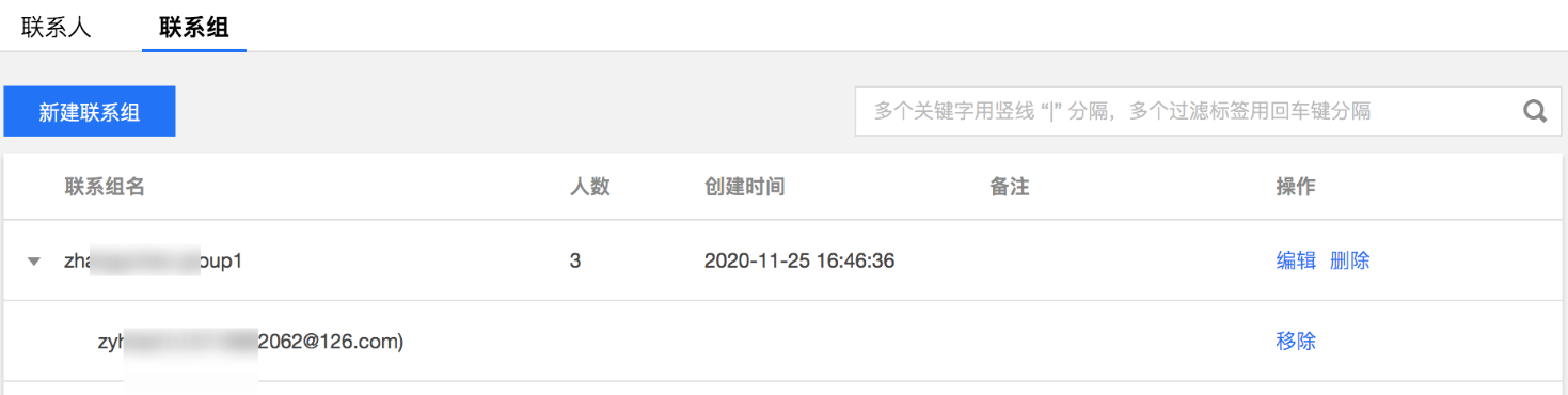 编辑联系组:在联系组对应的操作列单击编辑,修改联系组名和联系组中的联系人,单击确定。