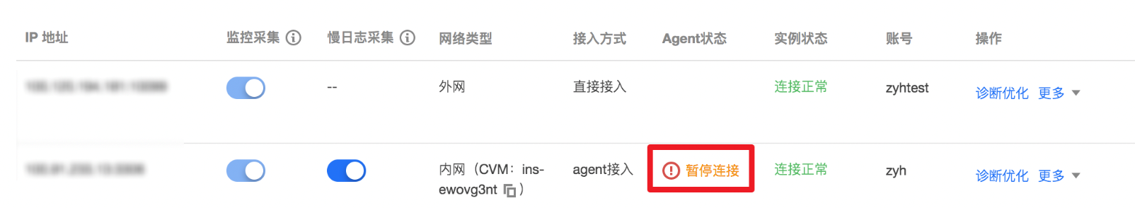 若在实例管理页面发现 agent 连接异常,在主机上输入如下命令,查看 agent 进程: