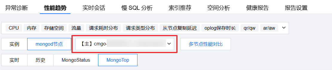 3. 在上方选择 MongoDB 数据库类型及实例 ID,选择性能趋势页签。