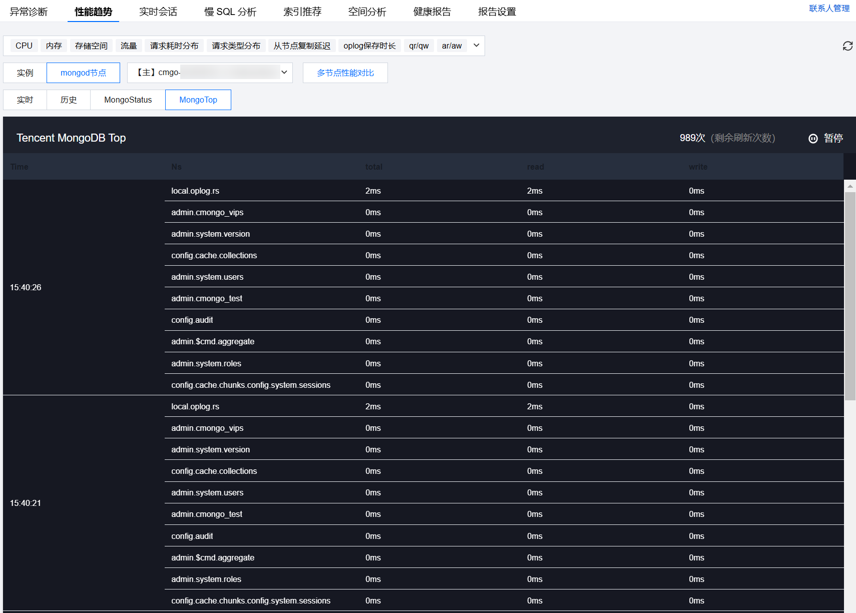 为方便数据库管理员的日常运维,DBbrain 为您提供了 Tencent MongoDB Top 工具,此工具与 MongoDB 官方工具类似,可实时查看节点维度 Top 表监控情况。