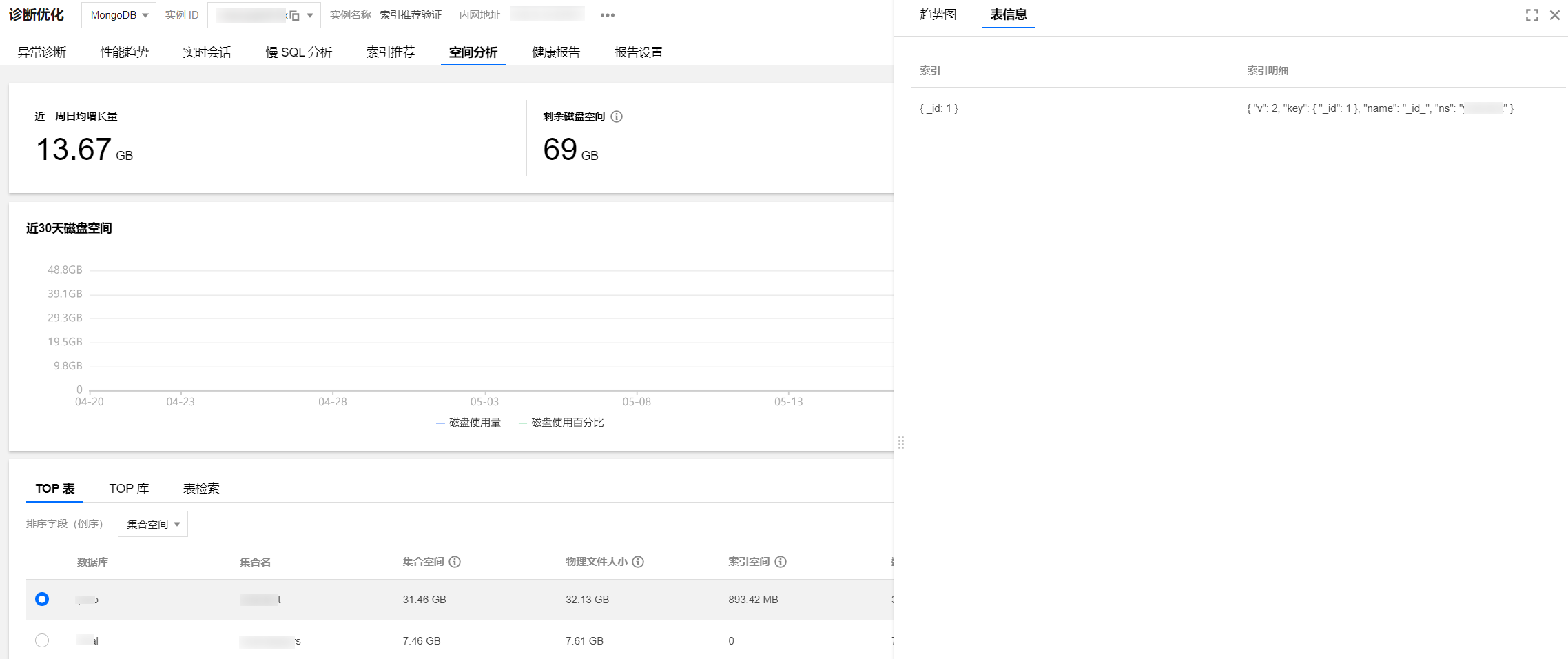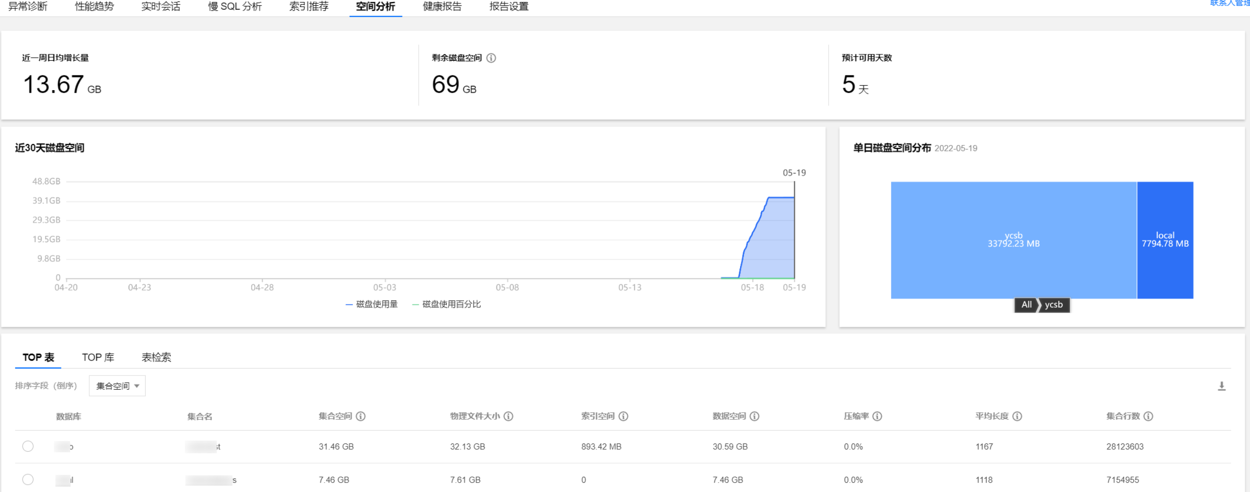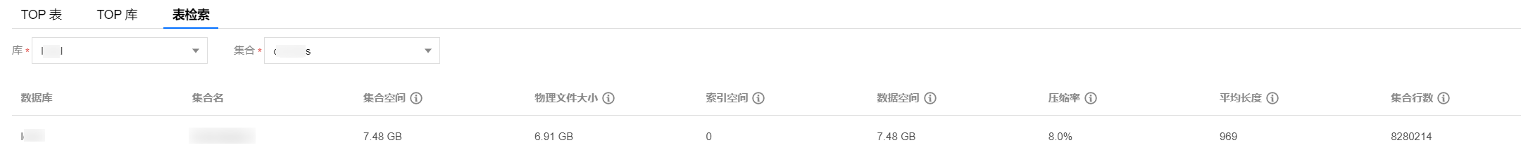 TOP 表为您展示当前占用空间较大表的详情,包括集合名、集合空间、物理文件大小、索引空间、数据空间、压缩率、平均长度和集合行数等。支持选择指定字段倒序排列,您可以通过此信息了解磁盘空间的使用详情,及时进行优化。