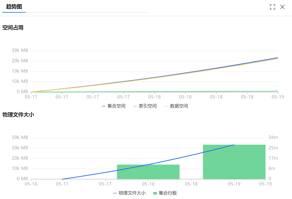 趋势图包含物理文件大小(物理文件大小、集合行数)、空间占用(集合空间、索引空间、数据空间)的趋势图。