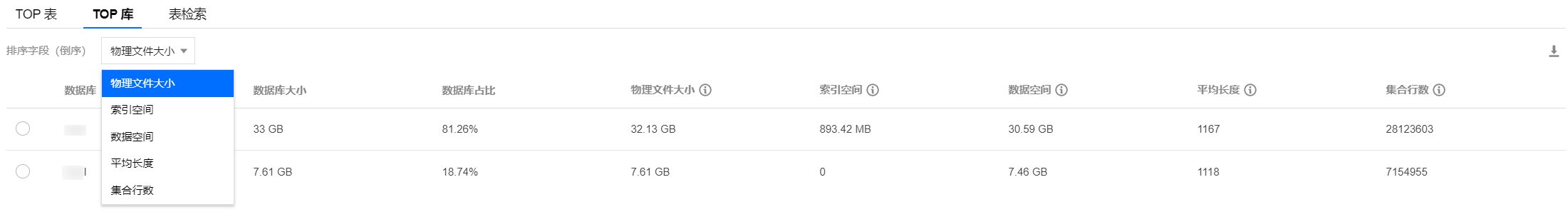 4. 选择 TOP 库页签,选择排序字段(倒序),包括物理文件大小、数据空间、索引空间、平均长度、集合行数,查看 TOP 库列表。