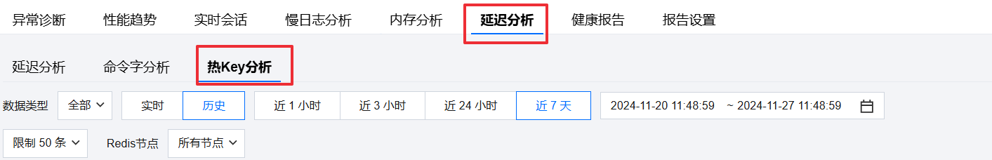 3. 在页面上方选择对应数据库和实例 ID,选择延迟分析 > 热 Key 分析页签。