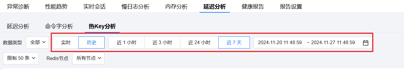 4. 在热 Key 分析页面,选择数据类型和时间范围,时间范围支持实时和历史视图的切换查看分析数据。