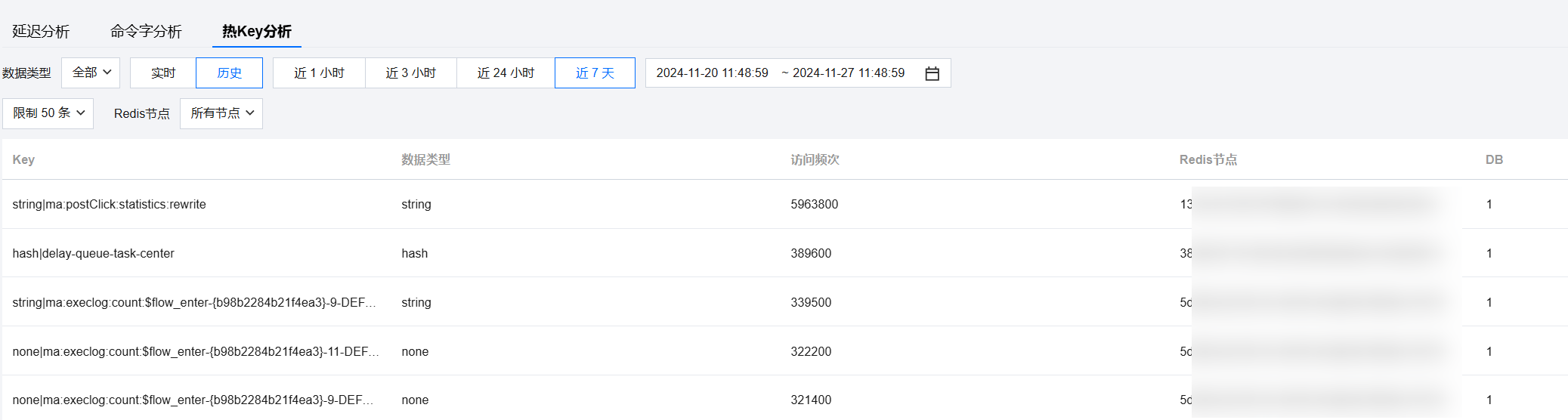 选择待分析的 Redis 节点和列表限制条数(支持限制50条、限制100条),查看分析数据。
