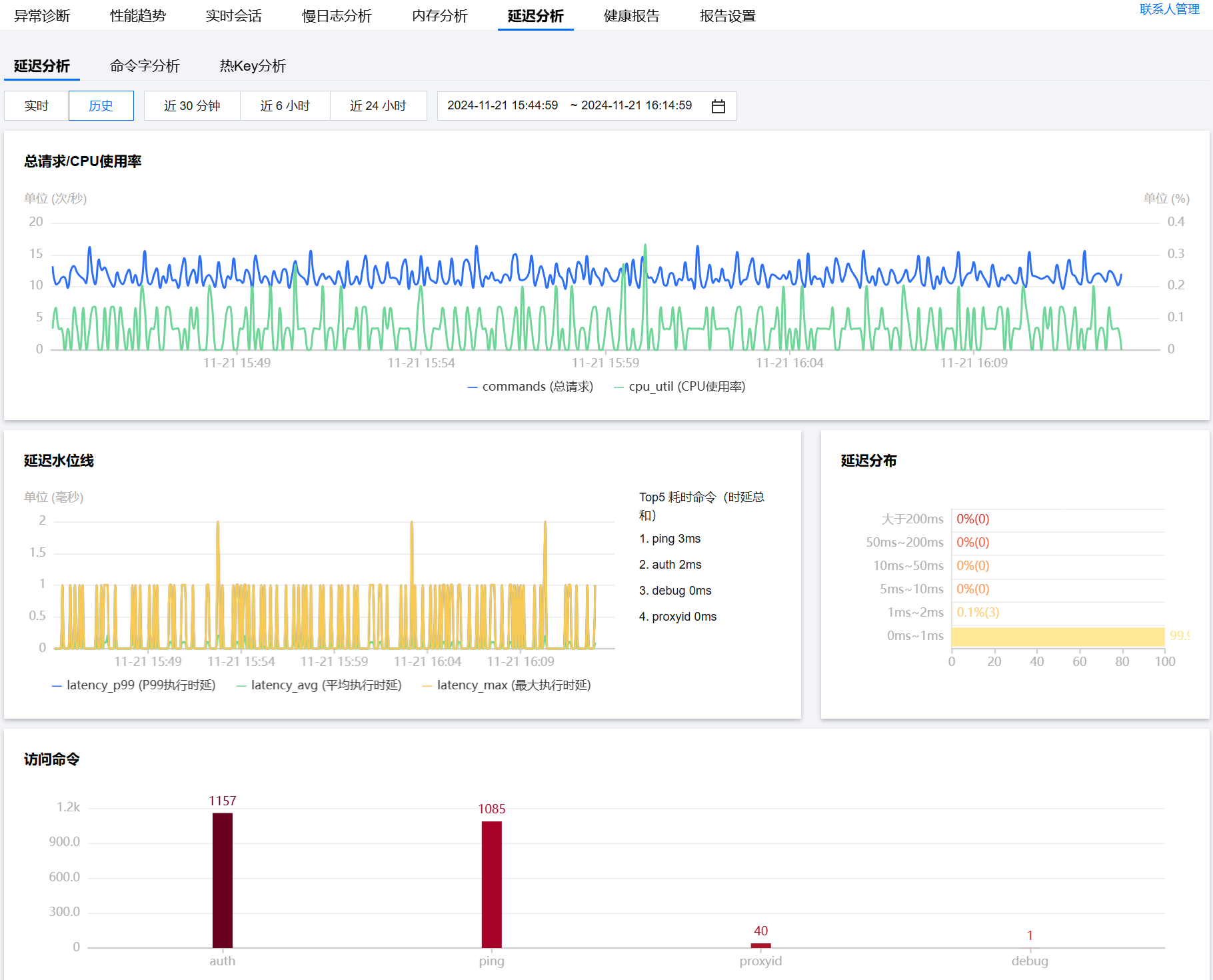 其中,延时分布展示不同延迟范围数据的百分比,更方便用户快速感知整体业务的延迟情况。访问命令展示耗时命令和命中次数。