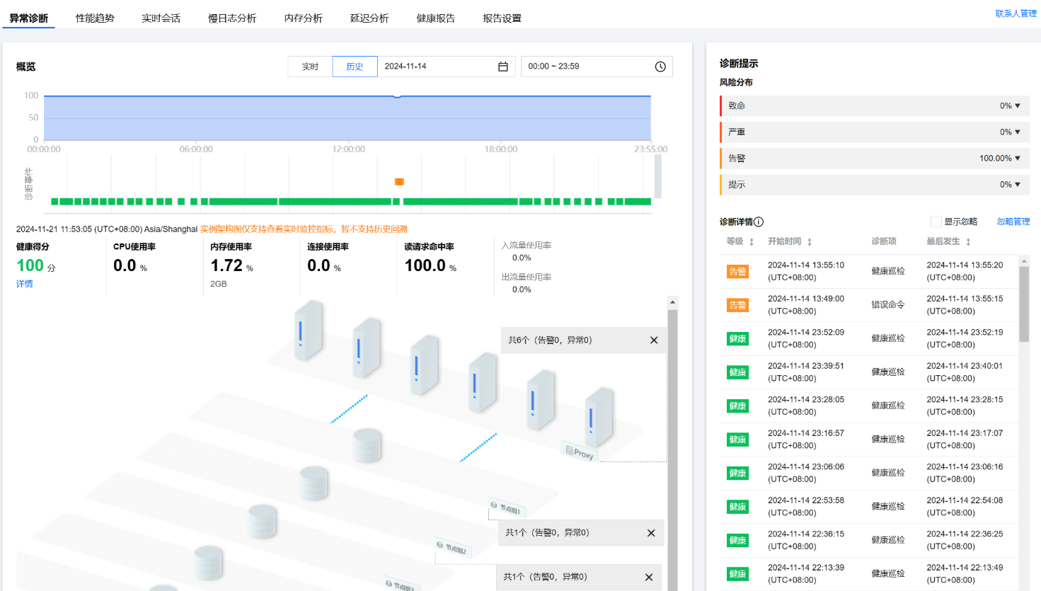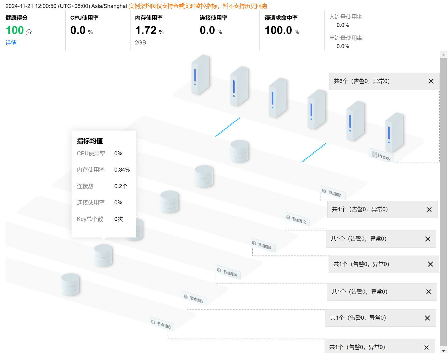 实例架构图:实例的 Proxy 和节点架构、发生告警的节点位置,将鼠标悬浮在对应节点上,鼠标悬停至对应节点或 Proxy 上,可显示对应的指标均值。