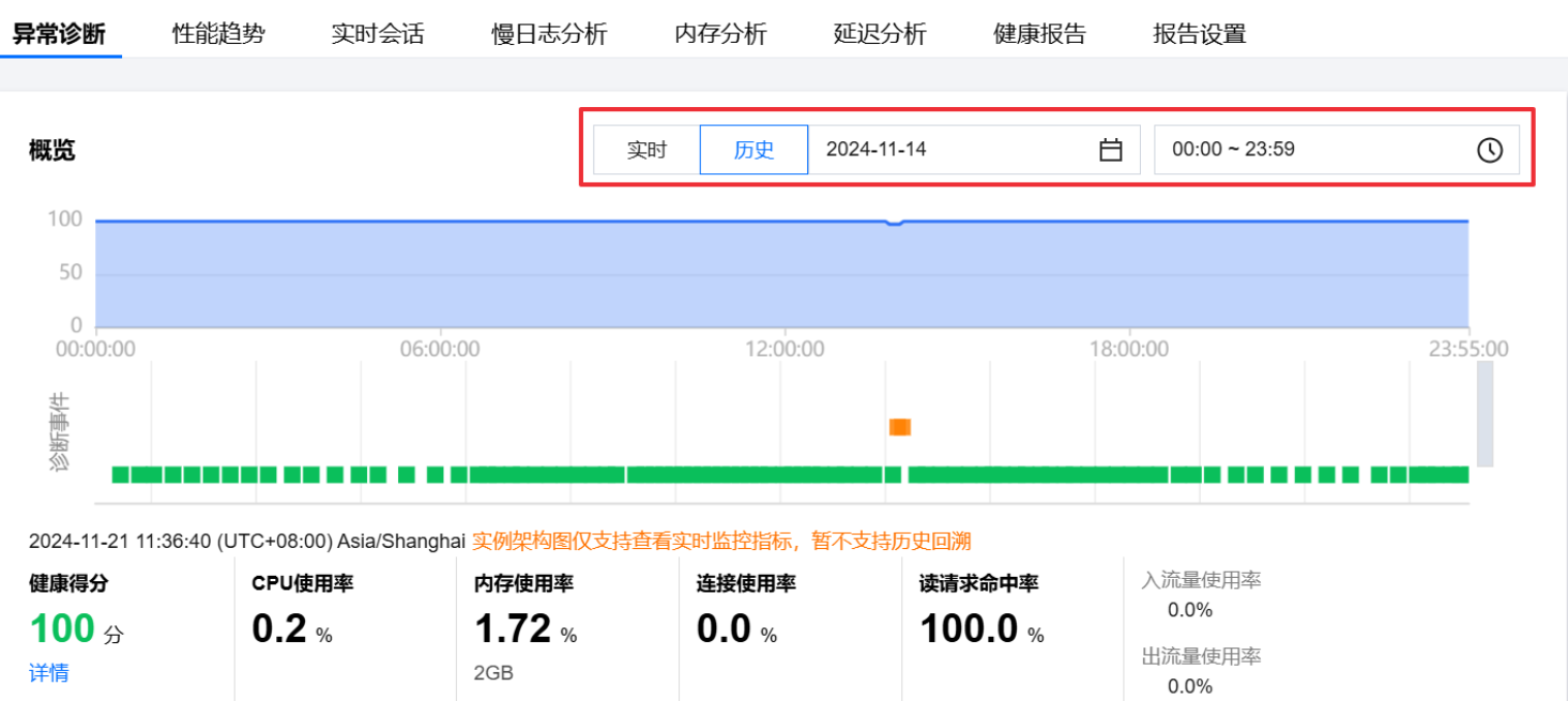 健康得分:健康得分、CPU 使用率、内存使用率、连接使用率、读请求命中率、入流量使用率、出流量使用率将展示实时数据信息。