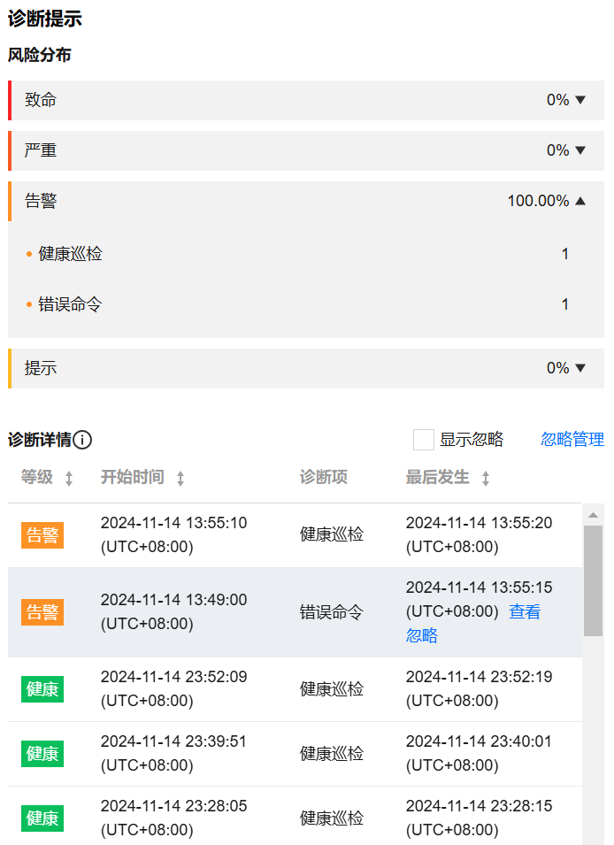 在诊断详情中,鼠标悬停至事件告警上,单击忽略,可选择忽略本条、忽略此类型,单击确定。