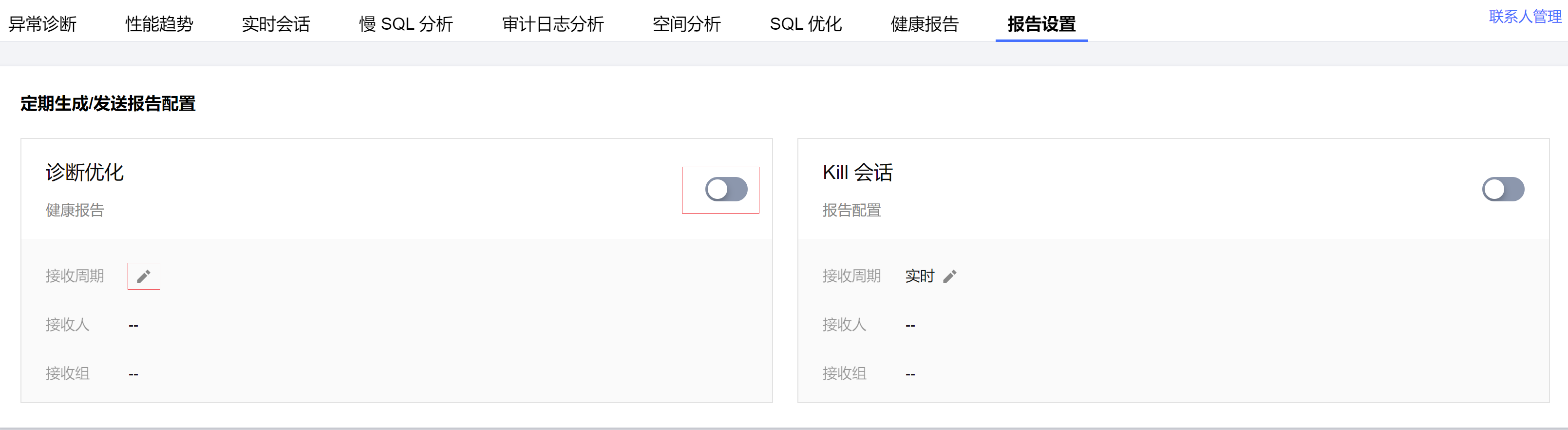 方式二:在左侧导航栏,选择诊断优化,在页面上方选择数据库类型并选择实例 ID 或分片 ID,选择报告设置页签。