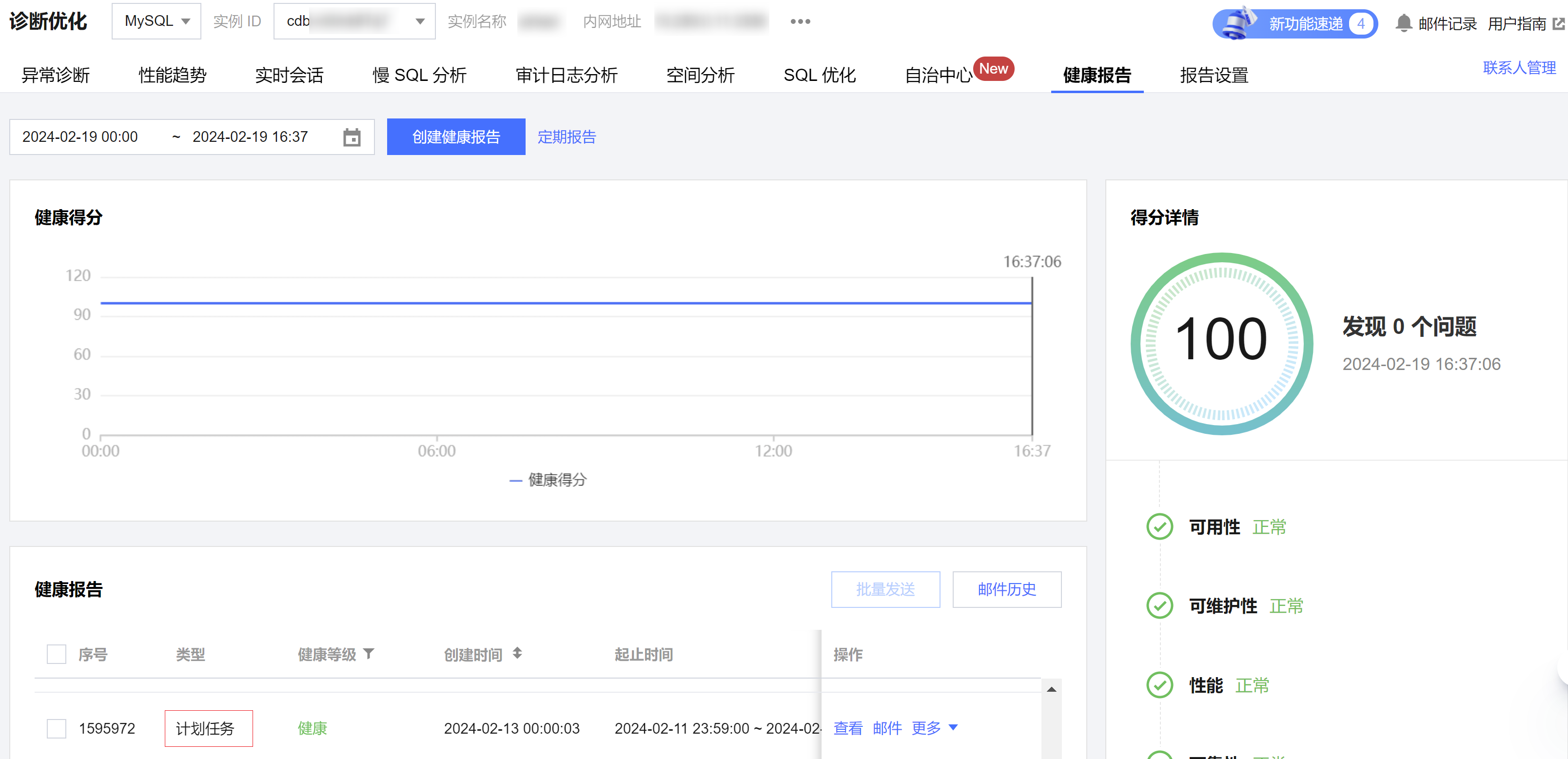 以上两种方式生成的健康报告,请在诊断优化 > 健康报告页面的健康报告区域查看类型为计划任务的健康报告。具体操作请参见 查看健康报告。 为实例创建单次健康报告