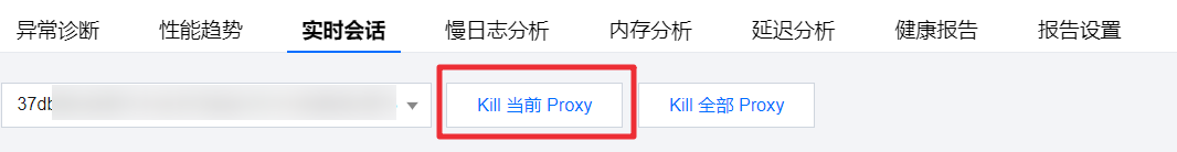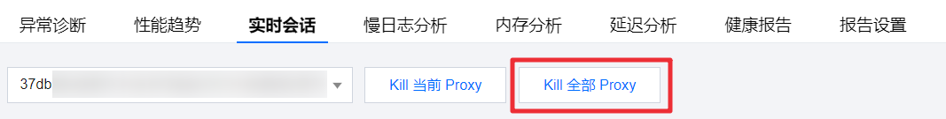 Kill 会话。DBbrain 支持 Kill 所选 Distributed Cache 实例当前 Proxy 或全部 Proxy 的客户端连接。
