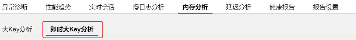 2. 在页面上方选择数据库类型 Distributed Cache 和实例 ID,选择内存分析 > 即时大 Key 分析。