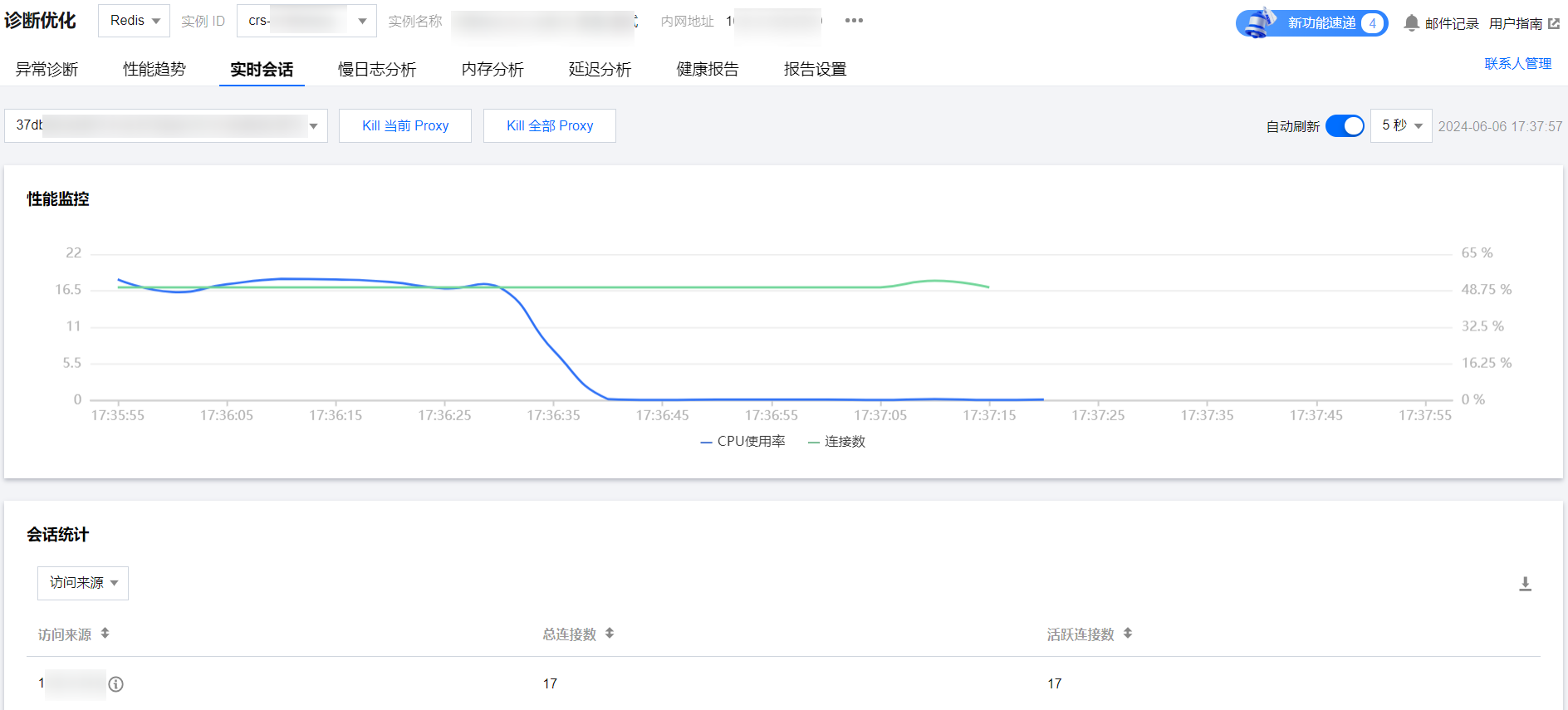 2. 在页面上方选择数据库类型 Distributed Cache 和实例 ID,选择实时会话页签。