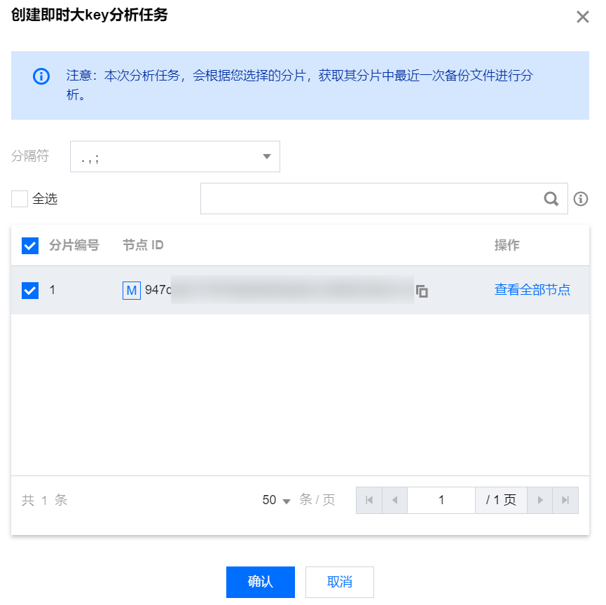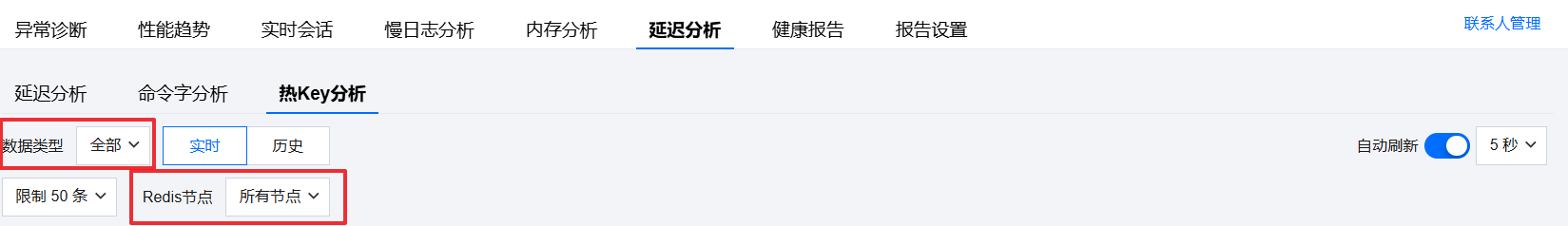 3. 在热 Key 分析页面,数据库类型选择全部,若明确 Redis 节点请选择具体节点,若不明确 Redis 节点请选择所有节点。