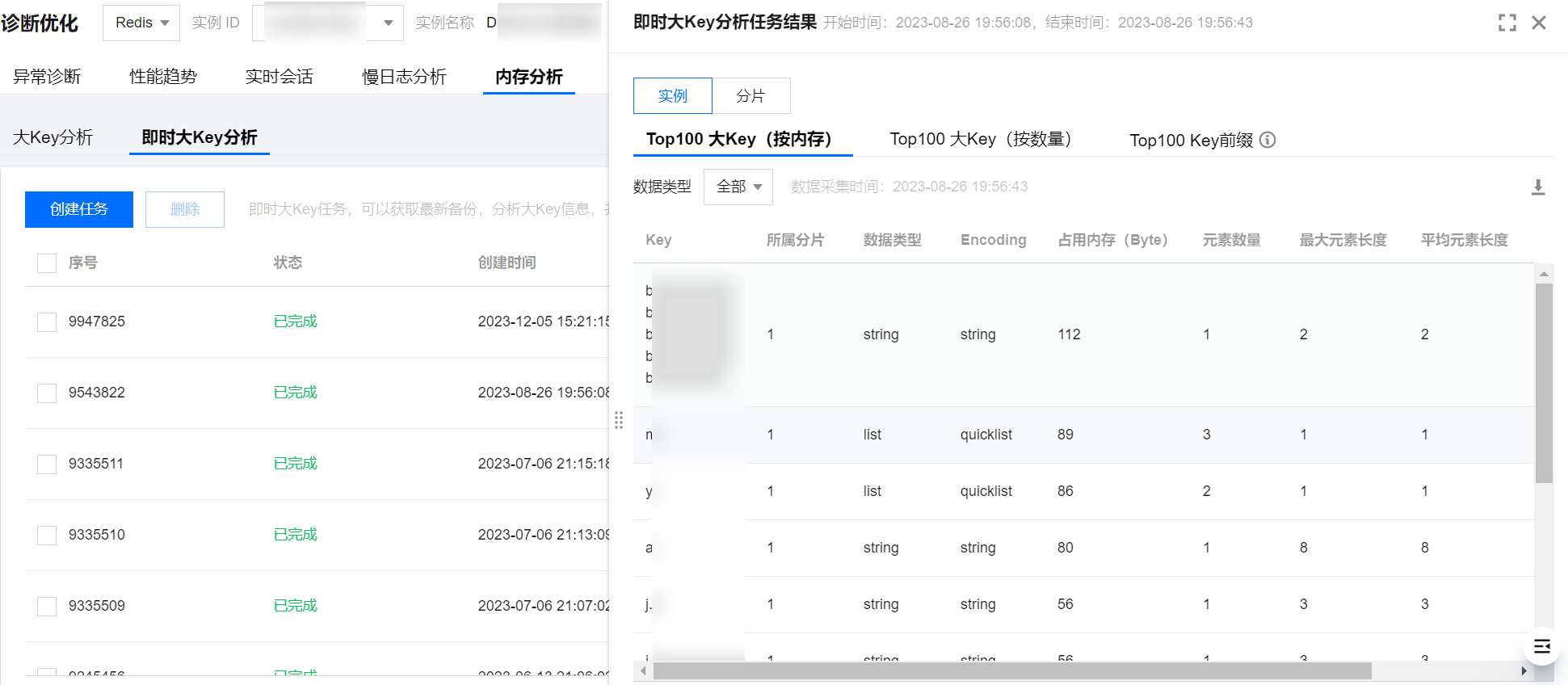 任务分析结果从 Top100 大 Key(按内存)、Top100 大 Key(按数量)、Top100 Key 前缀三个维度展示大 Key 分析结果,并支持从实例和分片两个维度查看大 Key 分析结果。