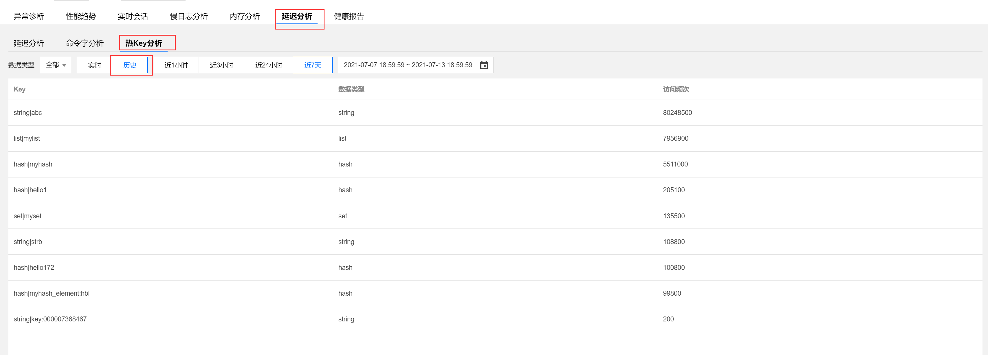 4. 选择实时或历史视图,选择待查看的时间段,查看访问频率高的热 Key。