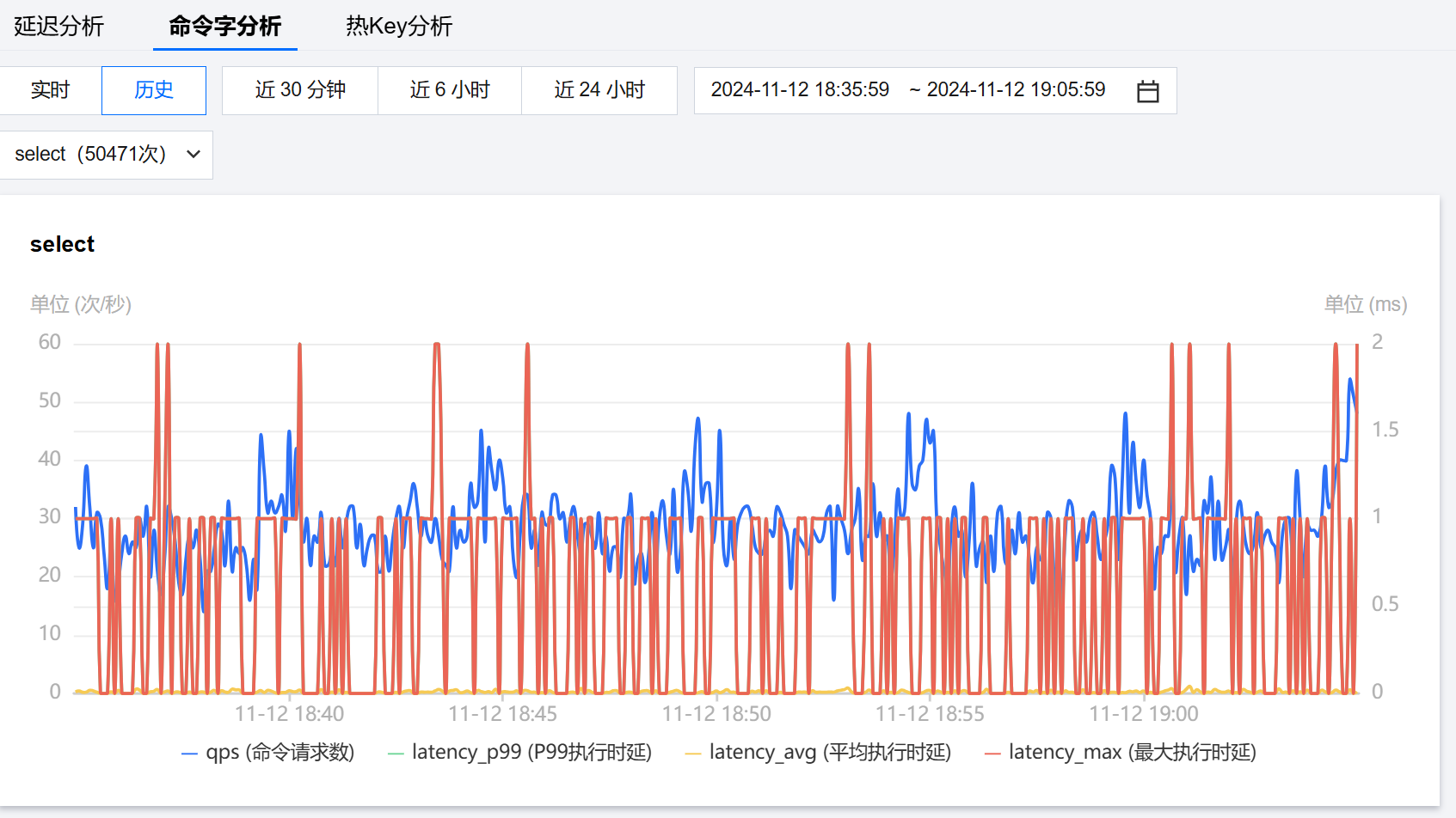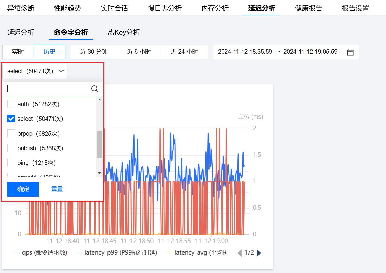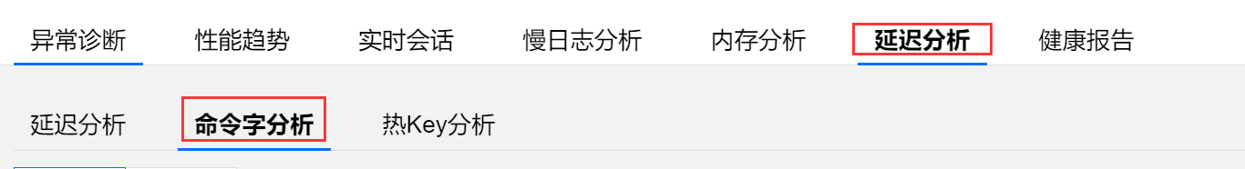 2. 在页面上方选择数据库类型 Distributed Cache 和实例 ID,选择延迟分析 > 命令字分析。