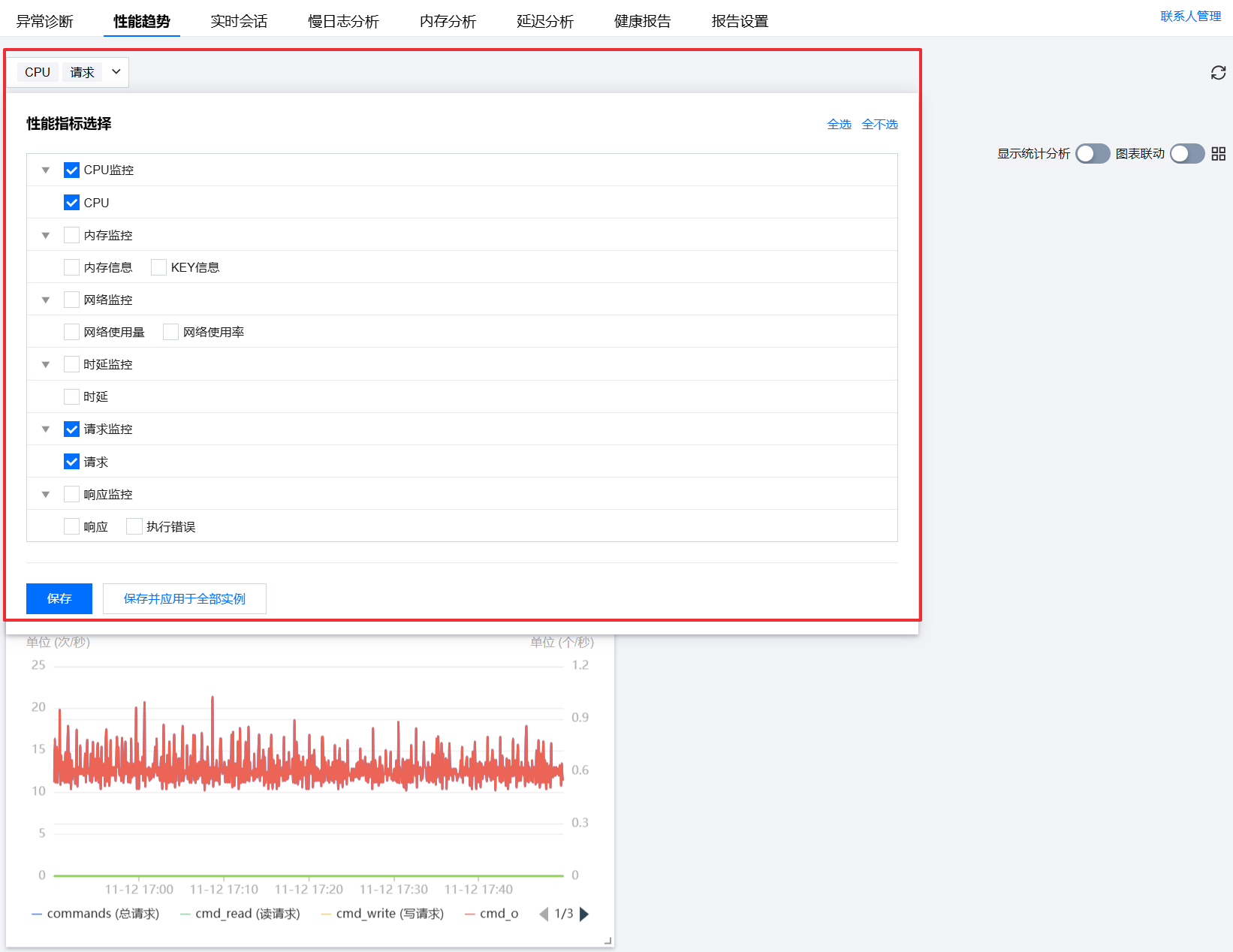 4. 单击性能指标下拉框,选择 CPU 监控和请求监控性能指标。