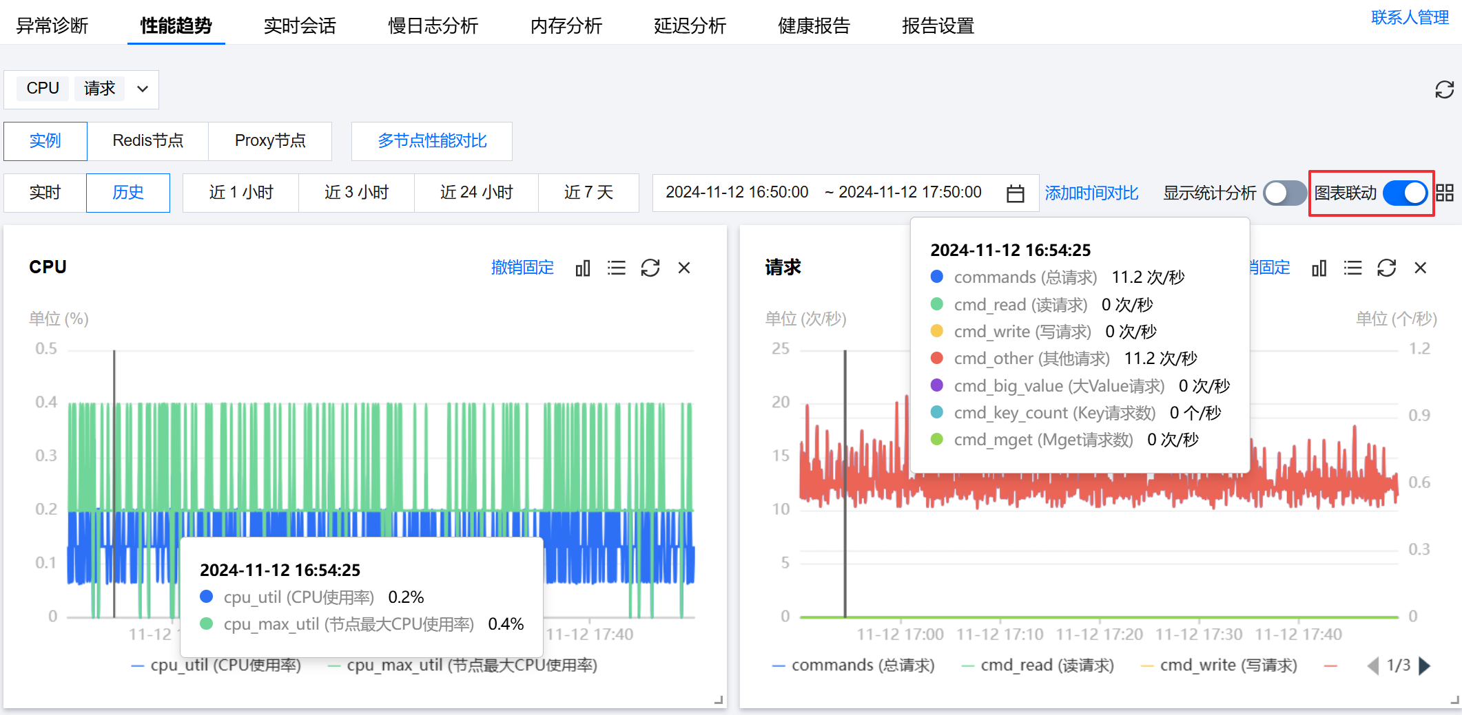 5. 在页面右上方开启图表联动,联动查看性能趋势图中,CPU 使用率高的时候是否读写请求同时高。