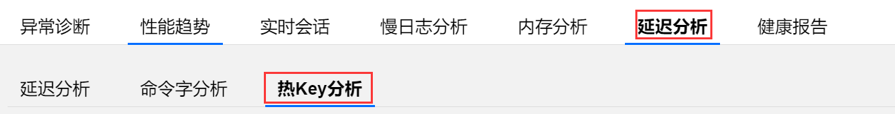 2. 在页面上方选择数据库类型 Distributed Cache 和实例 ID,选择延迟分析 > 热 Key 分析。