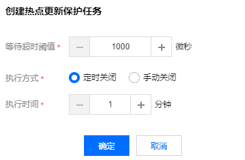 等待超时阈值 | 取值范围:1000~100000000。 表示热点更新保护队列中的等待时间。 当设置的阈值小于最大值100000000,在热点更新保护队列中的等待时间超过该阈值时,该事务跳出热点更新保护队列,按照原有的加行锁逻辑执行。 当设置的阈值为最大值100000000,在热点更新保护队列中的等待时间超过该阈值时,该事务将永远等待。 |