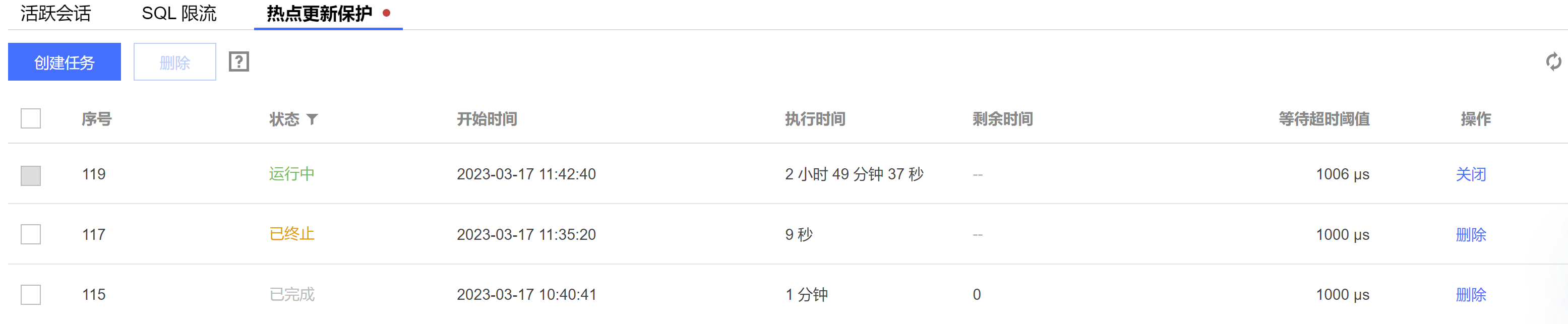 操作 | 关闭任务:当需要终止状态为运行中的任务时,可在操作列单击关闭。 删除任务:当需要删除状态为已终止或已完成的任务时,可单个或批量删除任务。 单个删除:在任务对应的操作列单击删除。 批量删除:在热点更新保护任务列表选择一个或多个待删除的任务,在任务列表上方单击删除。 |