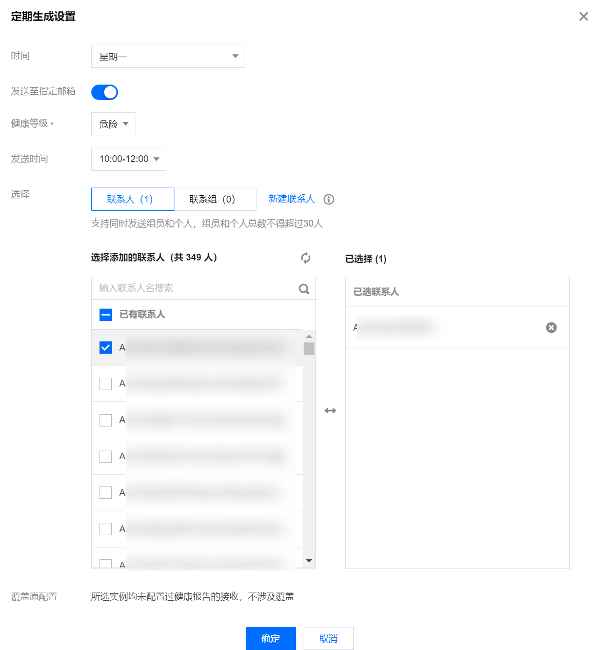 开启:开启后还需要配置健康等级、发送时间、选择联系人或联系组。健康报告生成后会给已选联系人或联系组在指定的发送时间以邮件的形式发送。