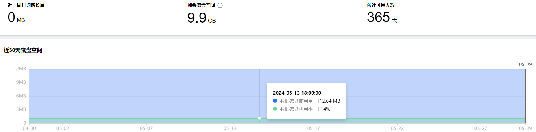 在空间分析页可查看近一周的日均增长量、剩余磁盘空间、预计可用天数,以及近30天的磁盘空间趋势表。