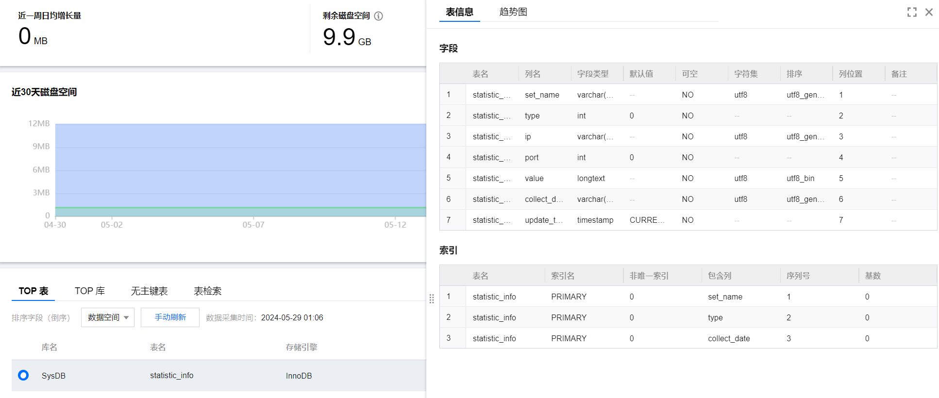 单击表所在行可查看表信息和趋势图。