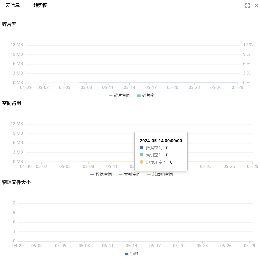:包含物理文件大小、空间占用(数据空间、索引空间、总使用空间)、以及碎片率(碎片空间、碎片率)的趋势图。