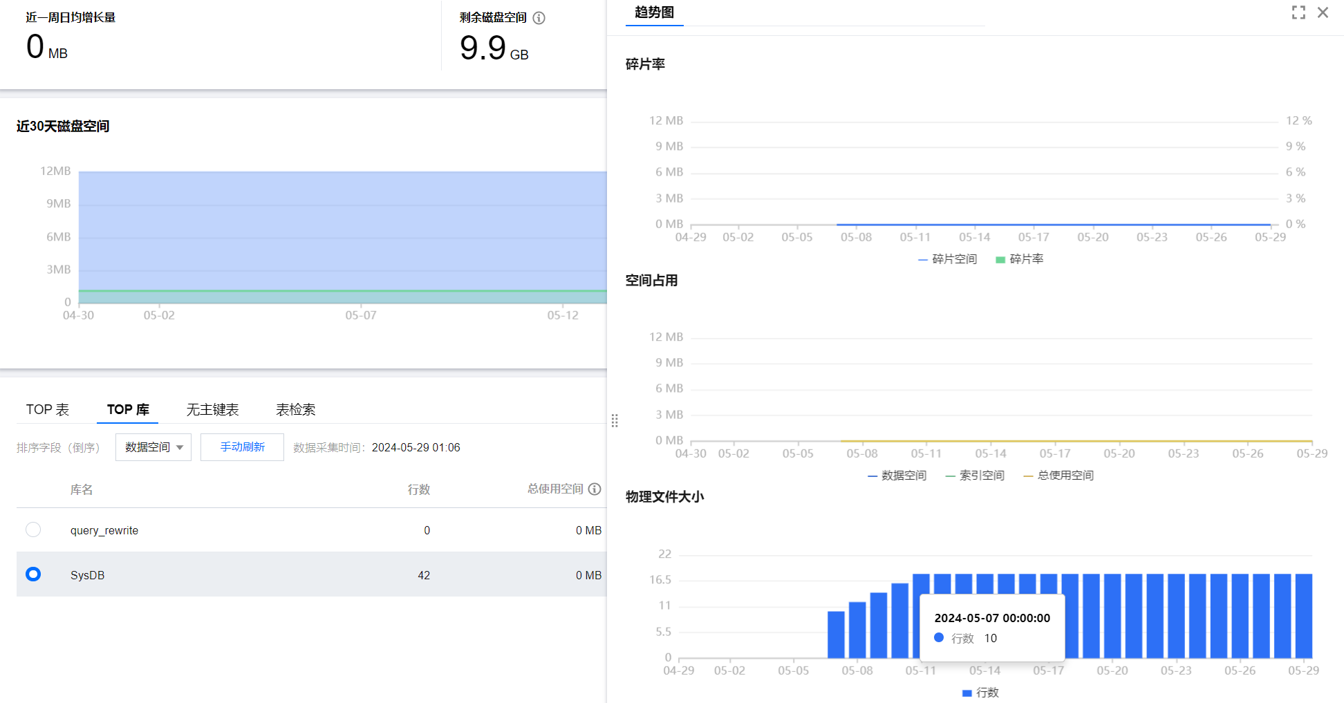 单击 TOP 库中的数据行,可查看趋势图。趋势图包含物理文件大小、空间占用(数据空间、索引空间、总使用空间)、以及碎片率(碎片空间、碎片率)的趋势图。