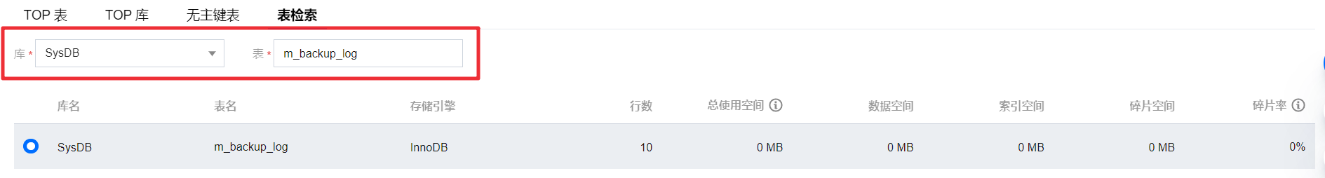 页签,选择排序字段(倒序),包括数据空间、索引空间、总使用空间、碎片空间、碎片率、行数,查看 TOP 库列表。